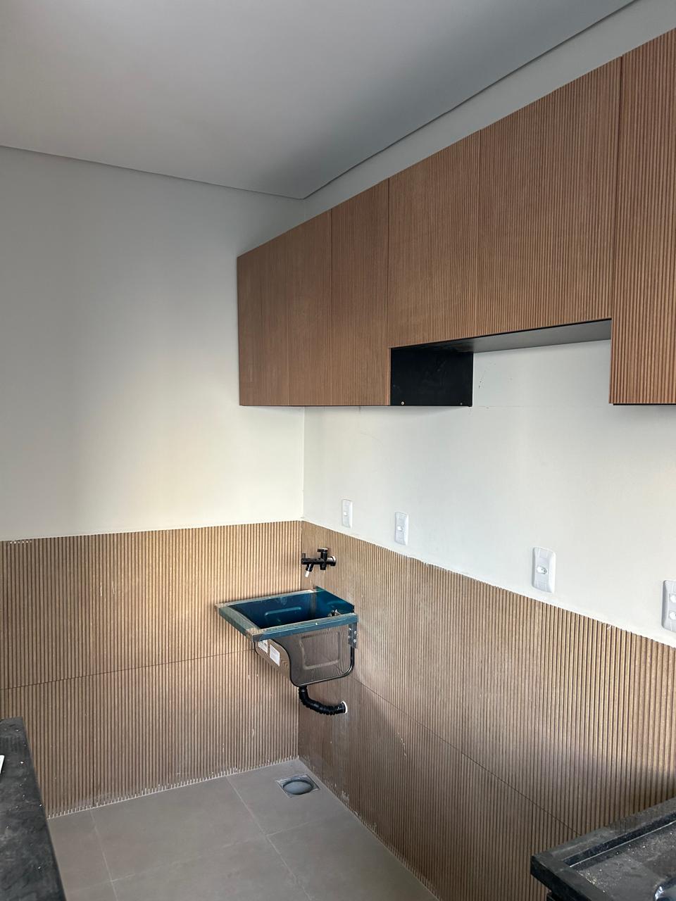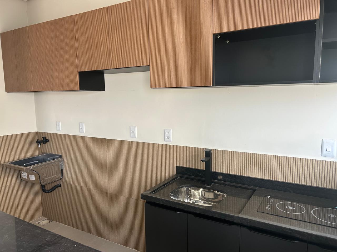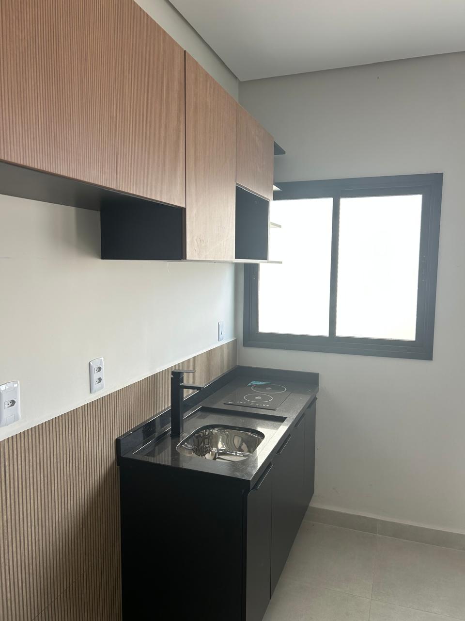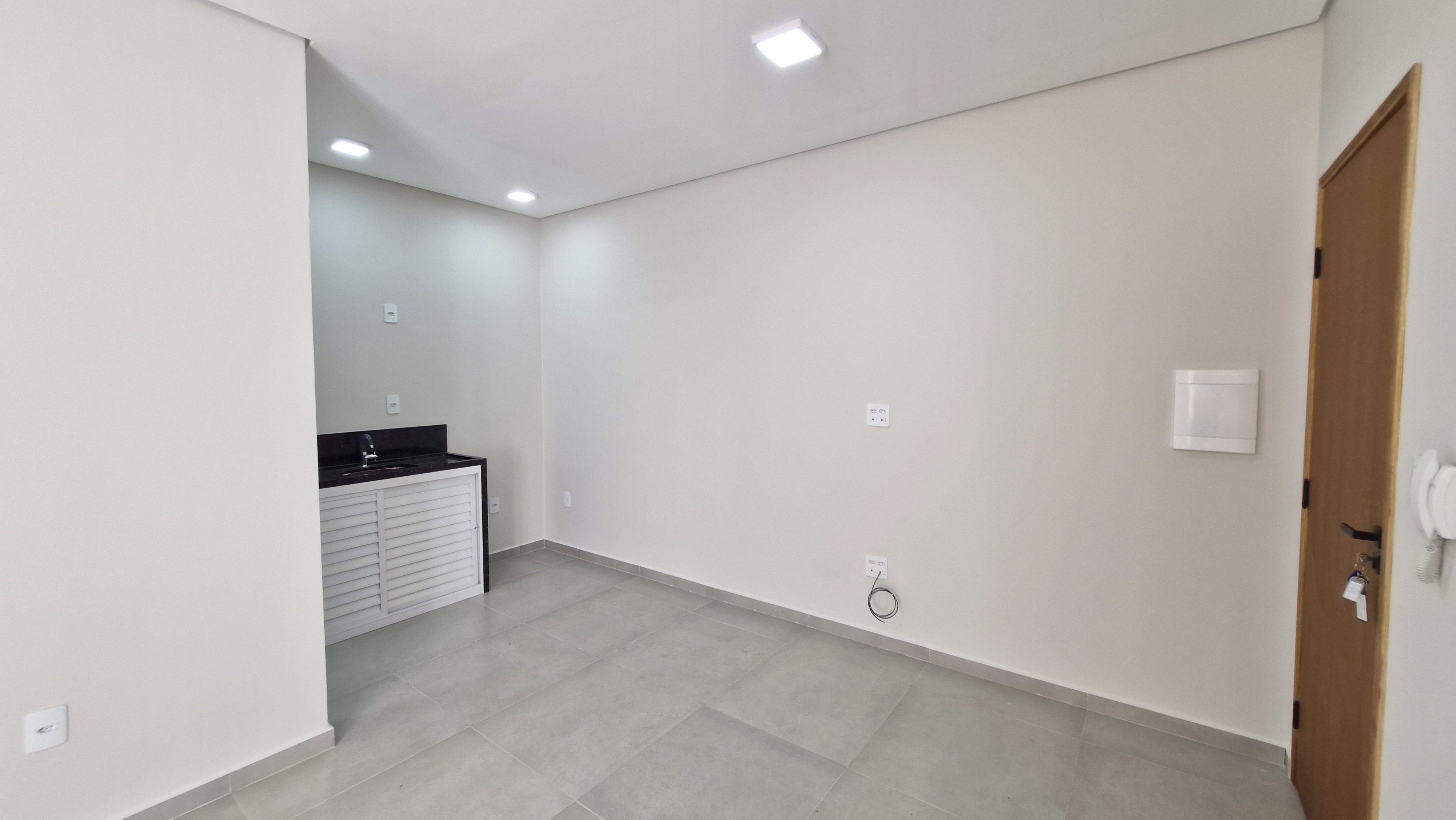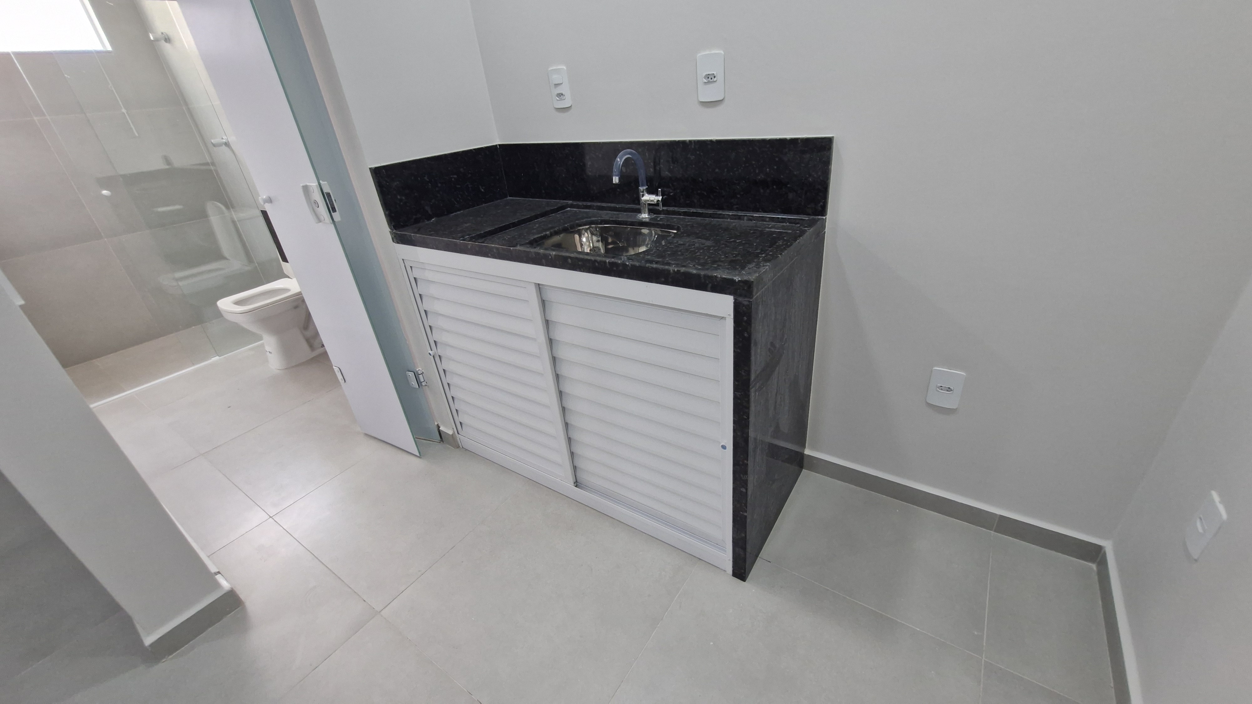 Descrição: Kitnet conjugada pia em granito, banheiro com box de vidro e lavanderia comunitária.