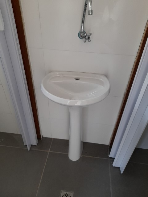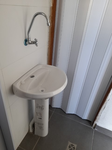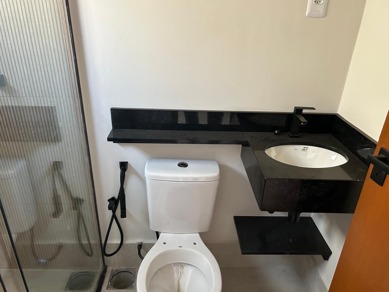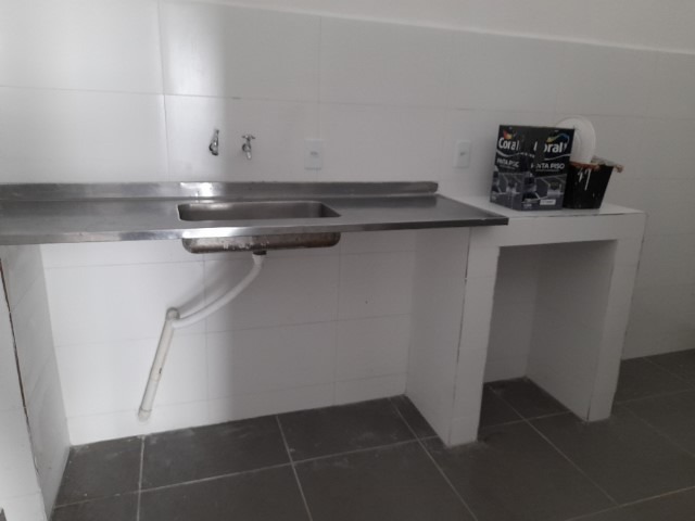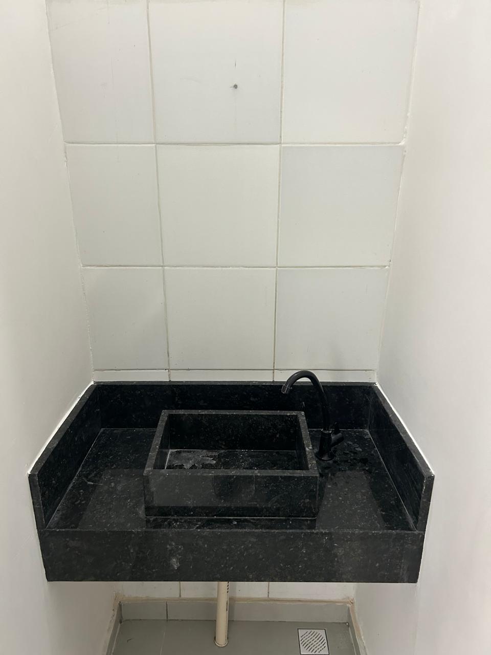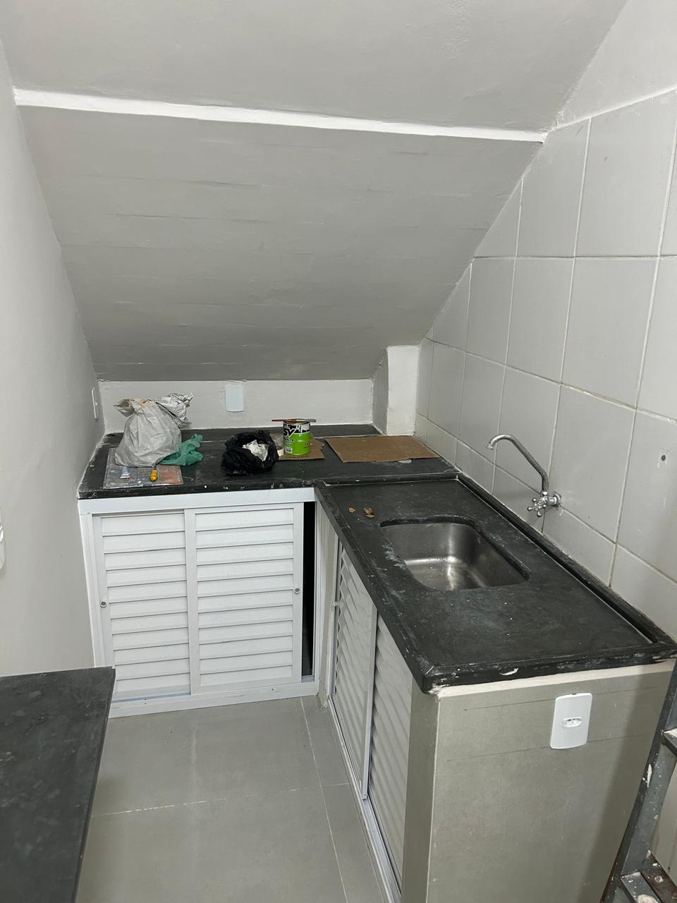 Descrição: Kitnet conjugada pia em granito, banheiro com box de vidro e lavanderia comunitária.
